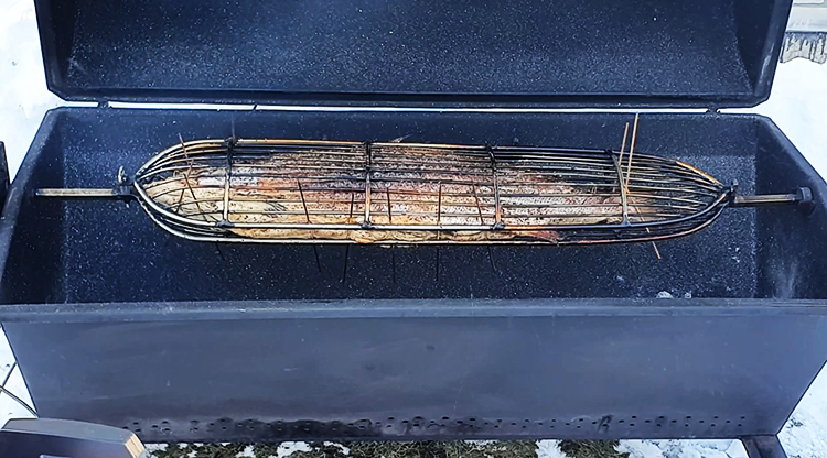 Grilējam uz oglēm lasi 9,8 kg. 92 cm. draugam un mazāko sev 8,1 kg. 83 cm. Laša sagatavošana grilēšanai: notīra zvīņas, ierīvē ar garšvielām kas domātas zivīm, pievienojot olīveļu un liekam ledusskapī. Marinēšanas laiks ir atkarīgs no laša svara un biezuma. Ja lasis ir līdz 5 - 6 kg. pietiks ar 7 - 9 st. ja svars ir tuvu 10 kg. rekomendējam marinēt līdz 18 - 22 st. pirms likt ledusskapī ietinam pārtikas plēvē, temperatūra marinējot no 2,2° līdz 2,4°. Pirms cepšanas plēvi noņemam, lasi liekam speciālā restē un grilā iekšā. Grilējam no 155° līdz 170° temperatūrā 1,6 st. Tad ietinam laša cepeti follijā un ļaujam cepties pie 140° vēl 50 min. Lasis ir gatavs, liekam galdā un baudam lielisko ēdienu. www.grila.lv Millera Grila Nams - MGN